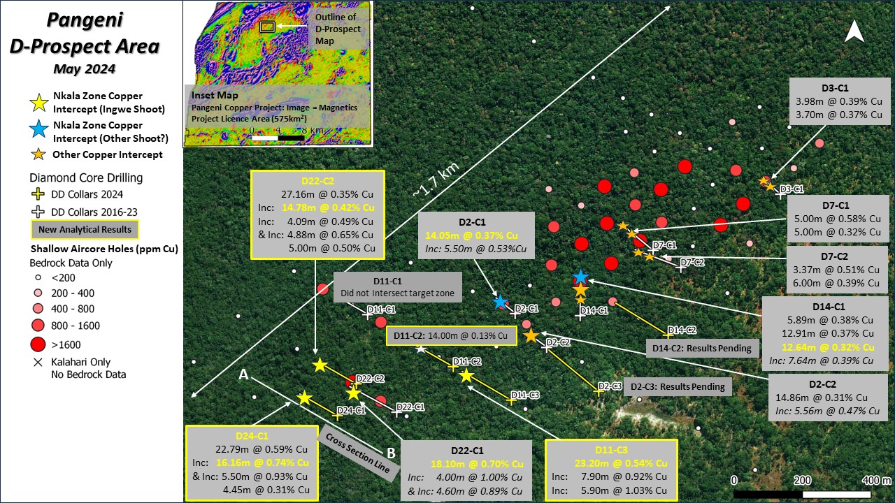 Figure 1: Pangeni Copper Project: D-Prospect: 2024 Drilling Program Results to Date: D24-C1, D11-C3, D22-C2 and D11-C2: Results, Plan Map with Previous Core Drill Holes, and Air Core Results (Inset Map Showing Project Licence Area of 575km2)