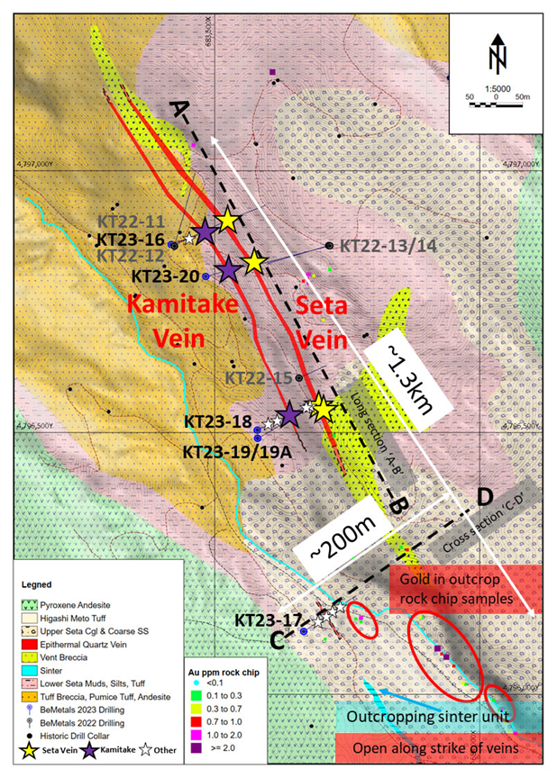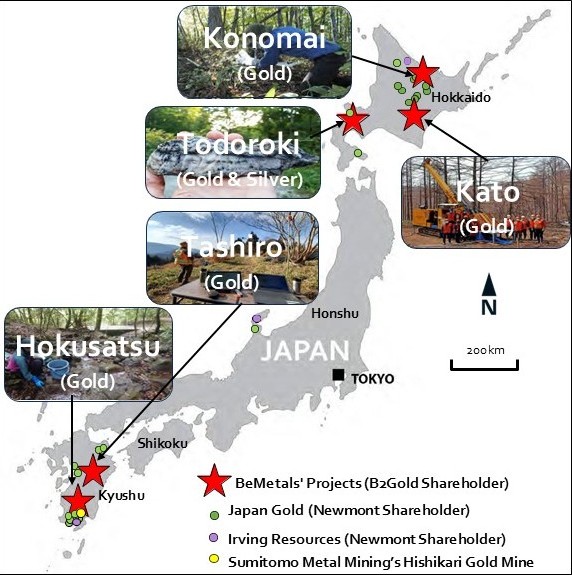 | Kato | Hokkaido | Advanced-stage project with strong drill results from quartz–adularia veins. Historical intercepts include 17.5 m @ 8.15 g/t Au and 18.65 m @ 5.01 g/t Au. Recent BeMetals drilling intersected 11.5 m @ 6.42 g/t Au and 26.1 m @ 3.06 g/t Au in the Seta Vein. |